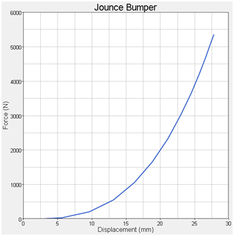 - jounce bumperのフォース対たわみカーブは、バンパーが接触点に触れたときに0.0になり、接触後はフォースが正の値、たわみも正の値のペアになります。