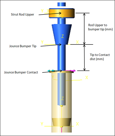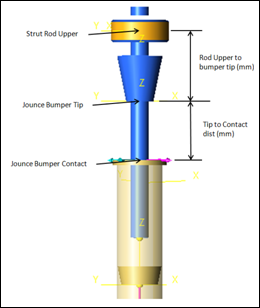Displacement Reference | 原点は、ジャウンスバンパーの先端となります。 Z軸は、ストラットロッド上部またはショック上部ブッシュを指します。 ストラットロッド(上部ストラット)またはショックロッド(上部ショック)に結合されます。 |