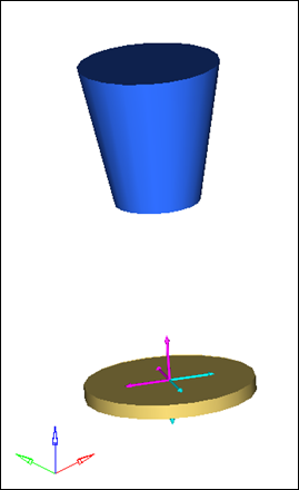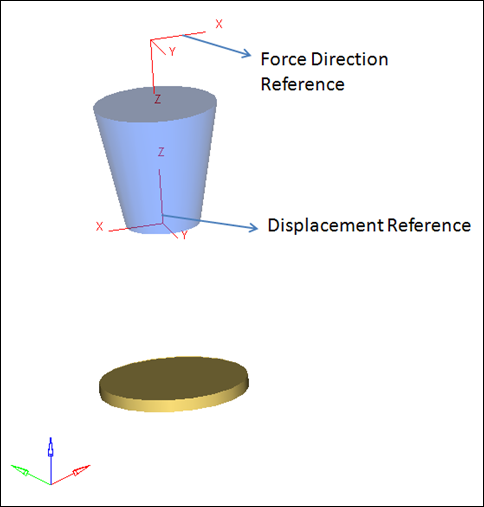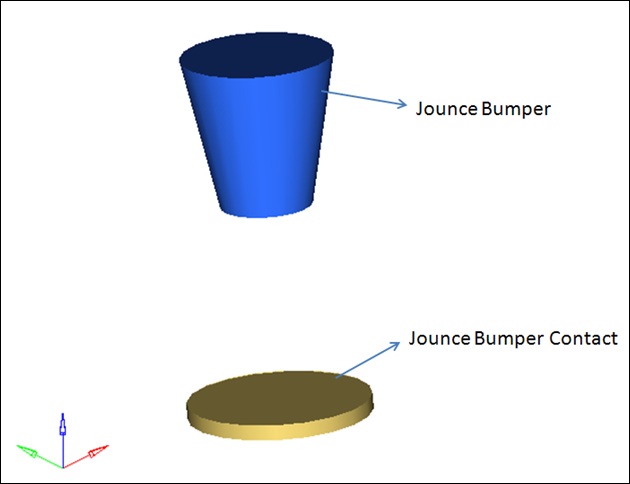 - このグラフィックスは、jounce bumperのフォースが発生すると同時に、jounce bumperのグラフィック(円錐で表現されている部分)が接触面のグラフィック(平坦な丸いプレート)を通過し始めるように定義されます。