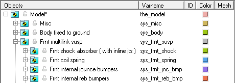 新しいサスペンションモデルを構築するときは、モデルに含まれるオプションのシステム(スタビライザーバーなど)をすべて使用してモデルを構築します。Projectブラウザを使用してオプションのシステムを直ちにオフにし、ベースサスペンションに対する解析を実行して適切な解が得られるようにします。オプションのシステムでデータを利用できるようになったら、これらオプションのシステムをアクティブにしてデータを読み込みます。
