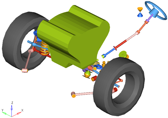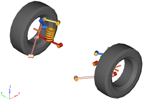 front multi-linkは、ハーフビークル解析とフルビークル解析のどちらでも使用できます。デフォルトの形状および質量は乗用車または小型トラックと同じですが、モデルおよびデータは、大型トラックから縮尺モデルの車まで、任意のサイズの車両を反映するように修正できます。 図 2. マルチリンク式サスペンションを使用する車両フロント半分のモデル