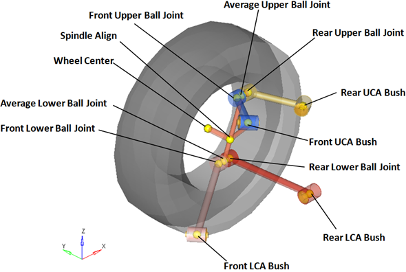 ポイントによって、サスペンションのボディを互いに結合するジョイントとブッシュの位置を定めます。以下の図に、front multi-linkサスペンションの主要ポイントを示します。図 4. 右側の主要ポイント – フロントマルチリンク式サスペンション