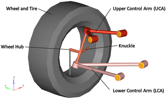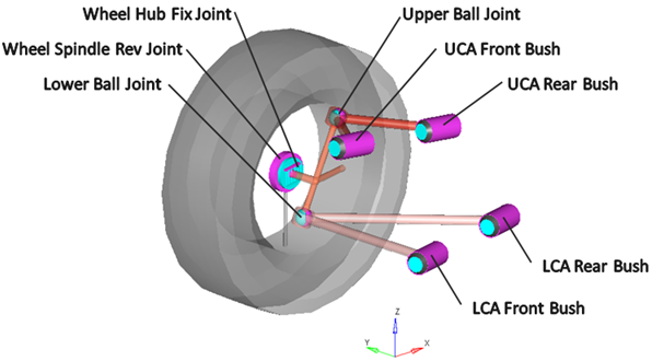 | LCA Front Bush | ブッシュ | ロアコントロールアーム | サブフレーム、車体、または地面 | LCAフロントブッシュ | CompliantオプションがNoに設定されている場合は、このブッシュは回転ジョイントになります。 |