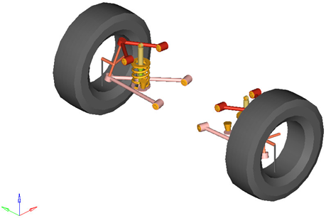 ダブルウィッシュボーン式システムは、車両半分の解析またはフルビークルの解析のどちらかで使用できます。デフォルトの形状および質量は乗用車または小型トラックと同じですが、モデルおよびデータは、大型トラックから縮尺モデルの車まで、任意のサイズの車両を反映するように修正できます。 図 2. 1ピース仕様のロアコントロールアームがあるダブルウィッシュボーン式サスペンションを使用する車両前部半分のモデル