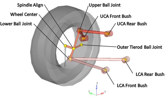 - アッパーコントロールアームのブッシュは、それぞれの軸が平行になるように定義されます。フロントブッシュが移動されると、フロントブッシュとリアブッシュの両方が、回転軸が同じになるよう再調整されます。ロアコントロールアームのブッシュの回転軸も、同様に定義されます。
