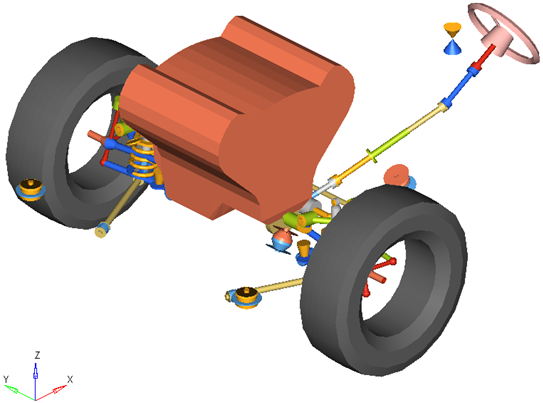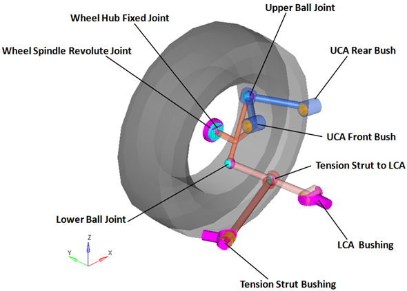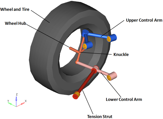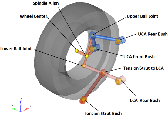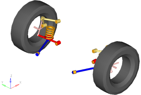 従来のデザインでは、コイルスプリング(または任意でトーションバー)、ショックアブソーバー、およびジャウンスバンパーは、ロアコントロールアームとシャシーの間で機能します。ロアコントロールアームは荷重の大部分を支持し、ナックルにおけるロアの球ジョイント位置の動きを定義します。アッパーコントロールアームは軽い荷重を支持し、ナックルにおけるアッパーの球ジョイント位置の動きを定義します。ナックルのステアリングモーションは、ステアリングシステムのタイロッドおよびモーションによって制御されます。車両ライブラリでは、ステアリングシステムにタイロッドが含まれています。