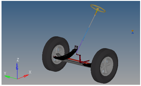 フロントソリッドアクスルサスペンションには、ソリッドフロントアクスルが取り付けられた車両フレームを支持するサスペンションシステムがあります。ソリッドフロントアクスルの両端には、ステア可能なフロントホイールが取り付けられています。フロントサスペンションは、ステアリングサブシステム、スプリング、ダンパ、スタビライザーバー、ナックル、タイロッド、ホイール、ホイールハブ、バンパーなどの部品で構成されています。Assembly Wizardで構築したフロントソリッドアクスルサスペンションがMotionViewのウィンドウに表示されます。図 1.