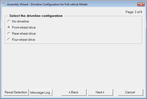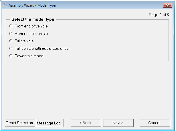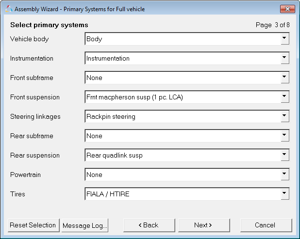 TiresドロップダウンメニューからFIALAを選択すると、Assembly Wizardの残りの部分の他のすべての選択肢で、フルビークルモデルでのタイヤ利用が有効になります。