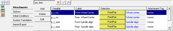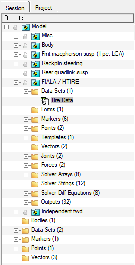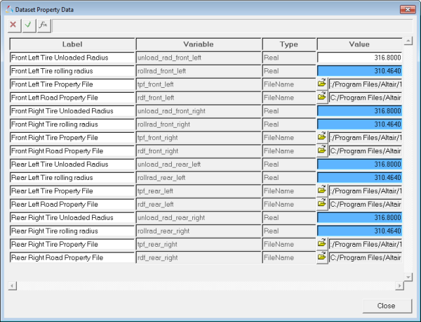 このシステム内には、“Tire Data”というMDLデータセットがあります。これには、タイヤプロパティファイル(.tir)および路面プロパティファイル(.rdf)への参照など、関連するすべてのタイヤデータが含まれています。 図 8.