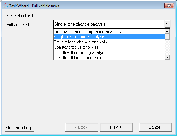 この後に、AnalysisメニューでTask Wizardを選択すると、フルビークル用のタスクのみが選択可能になります。