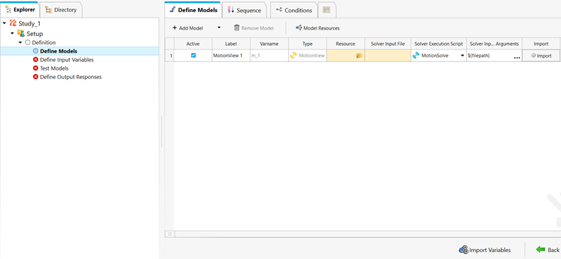 HyperStudy - Add Modelダイアログが閉じ、モデルがModelsテーブルに追加されます。注: 読み込まれるモデルのタイプによって、Solverオプションが決定されます。