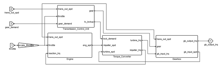 スロットル要求、インペラ(反作用)トルク、変速機の出力シャフトの回転速度がエンジンへの入力となり、これがトルクコンバーターのインペラを通してトランスミッションとカップリングされます。Engineブロックの出力は、エンジンのクランクシャフトの回転速度です。
