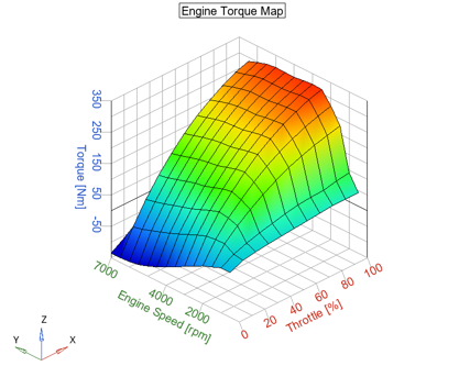 エンジン性能のインジケーターはトルク速度特性で表現され、エンジンマップを構成します。Twin ActivateのEngineブロックは、スロットルとエンジンスピードに基づいてエンジントルクを補間する2次元テーブルで構成されます。エンジンのクランクシャフトの回転を表す微分方程式は次のとおりです: