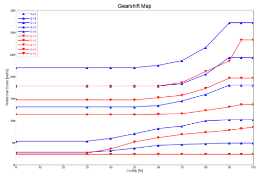 名前 ID 説明 単位 Clutch Capacity Cc クラッチが適用できる最大トルク。 Engine Inertia Ie エンジンボディとインペラボディの回転慣性。 Maximum Engine Torque max_net_torque エンジンが生成できる最大トルク。 Rated Engine Speed rated_eng_rpm エンジンの定格速度。 Maximum Engine Speed max_eng_rpm エンジンのクランクシャフトの最大角速度。 Initial Engine Speed omega_ini エンジンの初期角速度。 Engine Stall Speed Ll エンジンの失速速度。 Clutch Damping dc ロックアップクラッチのトーションスプリングの減衰係数。 Clutch Stiffness kc ロックアップクラッチのトーションスプリングの剛性係数。 Downshift Threshold ds2 – ds6 ギア2~6の、フルスロットルでダウンシフトするときのトランスミッション出力シャフト速度のしきい値。 Upshift Threshold us1 – us5 ギア1~5の、フルスロットルでアップシフトするときのトランスミッション出力シャフト速度のしきい値。 gratios gratios ギア比。 Gearbox Efficiency eta_gbox 変速機の効率性。 Lockup Threshold lock3 – lock5 ギア3~5の、フルスロットルでロックアップクラッチを接続するときのトランスミッション出力シャフト速度のしきい値。 Unlock Threshold unlock3 – unlock6 ギア3~5の、フルスロットルでロックアップクラッチを切り離すときのトランスミッション出力シャフト速度のしきい値。 Manual Option manual オートマチックとマニュアルのギア選択の切り替えオプション。 0、1 Minimum Time for Upshift us_wait アップシフト後に別のアップシフトを受け入れるまでの最小時間。 Minimum Time for Downshifting ds_wait ダウンシフト後に別のダウンシフトを受け入れるまでの最小時間。 Throttle Scaling scale_throttle スロットルのスケーリング係数。 0 - 1 Clutch Scaling clutch_torque_scale トルクコンバーターのロックアップクラッチが適用されるトルクをスケーリングする値。 0 - 1 Downshift Threshold Scaling downshift_th_scale ダウンシフトの計算済み速度しきい値をスケーリングする値。 0 - 1 Upshift Threshold Scaling upshift_th_scale アップシフトの計算済み速度しきい値をスケーリングする値。 0 - 1 Lockup Threshold Scaling lockup_th_scale トルクコンバーターのロックアップクラッチを接続するときの計算済み速度しきい値をスケーリングする値。 0 - 1 Unlock Threshold Scaling unlock_th_scale トルクコンバーターのロックアップクラッチを切り離すときの計算済み速度しきい値をスケーリングする値。 0 - 1 Minimum Throttle Opening Gradient for Tip-out correction min_throttle_grad_tipout それを下回るとアップシフトがブロックされる(チップアウト修正)、スロットル開度勾配の最小値。 TC Viscous Fluid Density rho トルクコンバーター内でインペラとタービンを連結させる粘性流体の密度推定値。 TC Diameter D トルクコンバーターの最大外径。