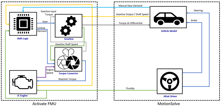 パワートレインモデルには、スロットル入力とエンジンスピードに基づいてエンジンのトルク出力を決定するために、2Dエンジントルクマップが組み込まれています。トルクを変速機に伝達するロックアップクラッチ付きトルクコンバーターと、ギアシフトとロックアップクラッチの接続を決定するトランスミッション制御ユニットも含まれています。