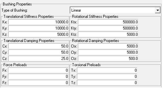 Type of BushingドロップダウンメニューからLinearオプションを選択すると、次のオプションが表示されます。- Translational Preload Properties/Rotational Preload Properties