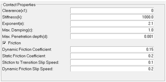 属性 タイプ 有効値 必須 impactStiffness 実数 > 0 はい impactExponent 実数 > 0 はい impactDampMax 実数 > 0 はい impactPenetrationMax 実数 > 0 はい frictionSwitch 文字列 ‘On’、‘OFF’ オプション dynamicFrictionCoefficient 実数 < 0 はい statisFrictionCoefficient 実数 < 0 はい stictionTransitionSlipSpeed 実数 - はい dynamicFricSlipSpeed 実数 - はい