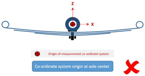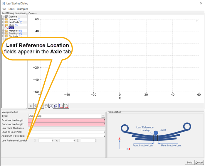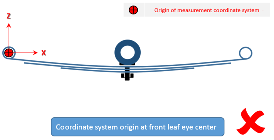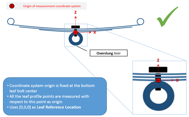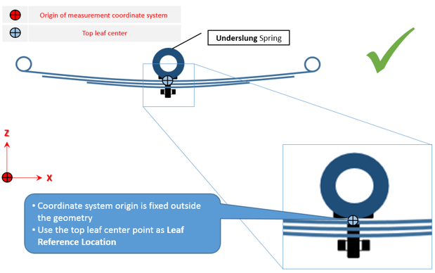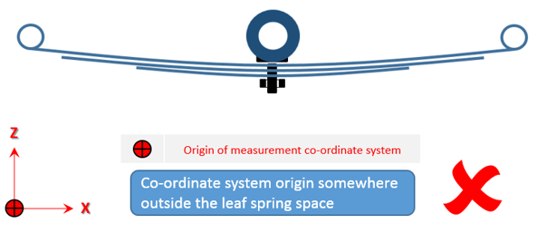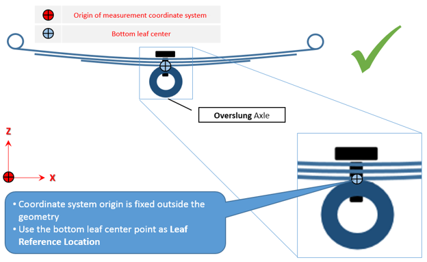 フリー形状では、リーフがパックに組み立て済みになっていますが、車両には取り付けられていません。すべてのリーフがまとまって単一のユニットを形成します。この状態では、一貫した座標系でのみ測定を行う必要があります。また、Axleタブで正しいリーフ参照位置を入力する必要があります。この位置にリーフ参照マーカーが作成されます。