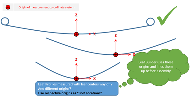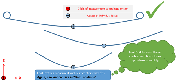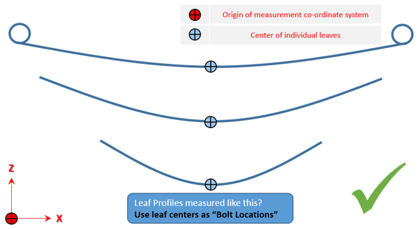 • Pre-Assembly:Pre-Assemblyには、各リーフごとに個別のリーフプロファイルがあります。これらの個別のリーフプロファイルは、組み立て荷重を伴って、ボルトで一緒に固定できます。下の図は、リーフのデータがどのように収集されるかを示しています。各リーフのフリー形状データが使用可能な場合は、このオプションを使用してリーフパックを作成することをお勧めします。