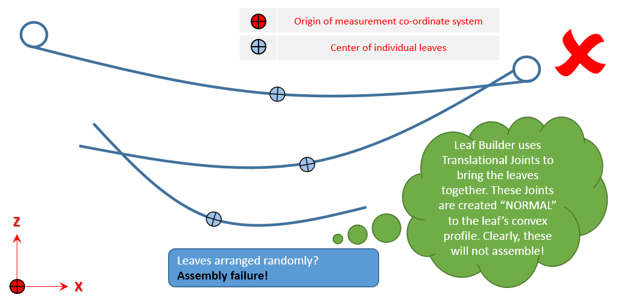 各リーフのボルト穴の軸が、他のすべてのリーフおよびZ軸平行になる必要があります。各リーフの垂直位置は、リーフどうしが接触しないように、組み立て中にMotionSolveによってオフセットされます。