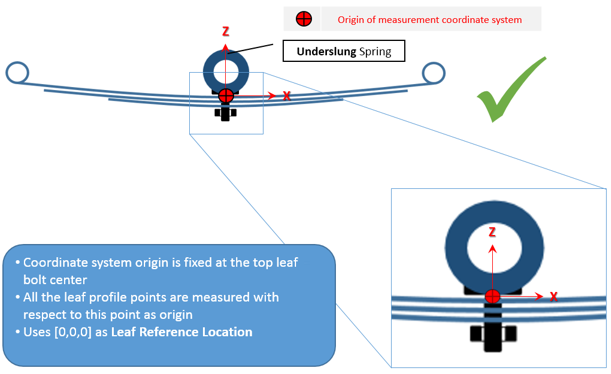 Leaf Spring Builderが作成するのは、ソフトウェアで入力されたリーフ形状入力と同程度のMotionView MDLリーフスプリングモデルのみです。そのため、必要な座標系におけるリーフ形状の正確な測定が重要になります。座標系、その原点、および向きは、Leaf Spring Builderからリーフスプリングを作成するときに役立つ特定のルールに従う必要があります。