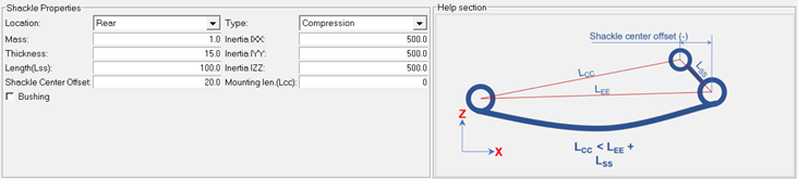 オプション shackleMass 実数 - はい shackleThickness 実数 - はい shackleInertiaIXX 実数 - はい shackleInertiaIYY 実数 - はい shackleInertiaIZZ 実数 - はい shackleLength 実数 - はい shackleCenterOffset 実数 - オプション eyeToShackleLength 実数 - オプション