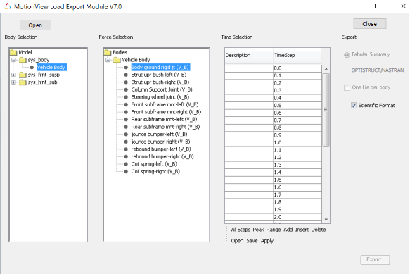 Body Selection | Openをクリックしてメタデータファイルを選択します。フォース出力がリクエストされている全てのボディが、パネルのツリー構造にリストされます。ユーザーは、ツリーリストからボディ(複数可)を選択できます。選択された各ボディについて、そのボディにかかるすべての荷重がForce Selectionパネル内に表示されます。 |