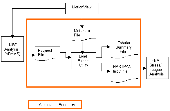 Load ExportユーティリティをMotionViewと組み合わせて使用し、上記の機能を実行します。このユーティリティを使用するには、MBDモデル内の荷重が処理されるべきコンポーネントを指定する必要があります。この指定を実現するには、MotionViewのGUIを使用するかMDL MBDモデルファイルを編集して、ボディに関するフォースの出力リクエストを追加します。ADAMSを使用してモデルをMBD解析すると、ユーティリティへの入力ファイルとして使用するADAMSリクエストファイルとメタデータファイル(ボディに対するフォース出力の情報を収めたMotionView ASCIIファイル)が得られます。Load Exportの適用範囲は以下に示すとおりです:図 1. 相互作用図