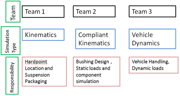 自動車業界で広く使用されているプロセスでは、サスペンションの設計と開発を別個の3つのステージに分けています。各ステージは、通常、この車両開発プログラムの間、異なる場所で異なる時間帯に作業している異なるチームによって実行されます。理想的には、チームはモデルデータ、モデリング手法および結果を幅広く共有します。チームは同じ車両を対象に作業しているため、1つのグループが学んだエンジニアリング上の教訓は他の2つのチームと共有する必要があります。