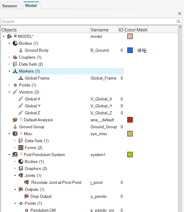 - デフォルトのグローバルエンティティ(Ground Body、Global Vectorsなど)は、Modelフォルダの下の一番上にリストされ、その他のコンテナフォルダがその下に続きます。