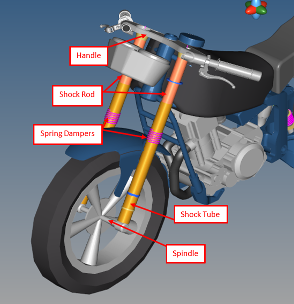 ボディ(スライダーとフォークチューブ)は、スライド動作を可能にする並進ジョイントとステアリングを可能する回転ジョイントで拘束された剛体ボディエンティティです。図 1.