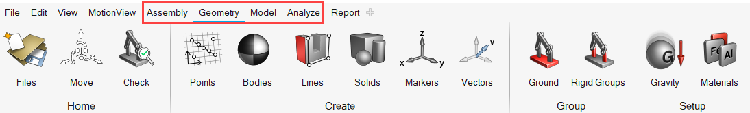 MotionViewリボン MotionViewの上部にあるリボンからは、ツールや標準機能に素早くアクセスすることができます。 図 1. アイコンをクリックすると、関連ツールが開きます。注: 一部のツールは、リボンのグループメニューから選択して開く必要があります。図 2.