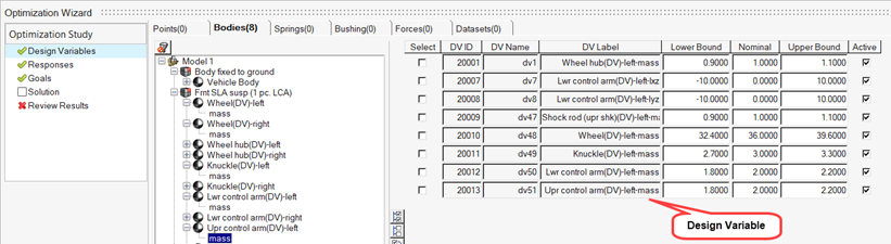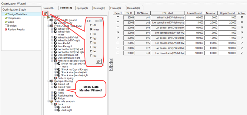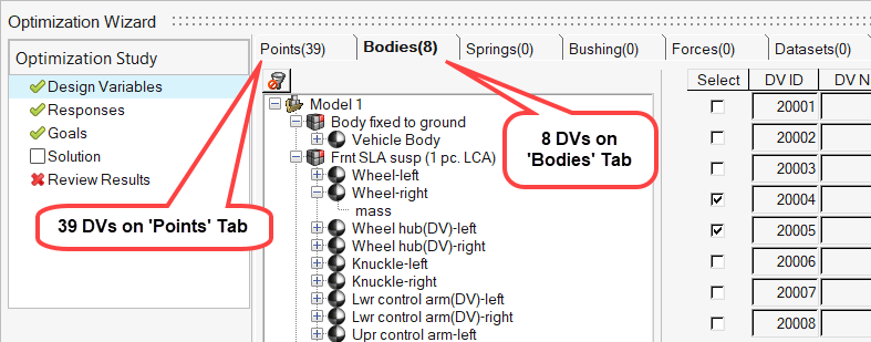 Optimization Wizardダイアログで、設計可能エンティティのタブ(Points、Bodiesなど)のいずれかをクリックします。