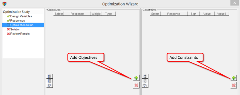 Optimization WizardのOptimization Setupセクションにある目標または制約のセクションでAddボタンをクリックします。