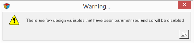 - 既存のDVに相当するデータメンバーを、最適化ウィザードの外部でパラメトリック(従属数量)にすると、そのDVは無効になり(以下の図のようにグレイアウトされます)、最適化スタディで考慮されなくなります。この場合は、ウィザードを開始すると警告も表示されます。
