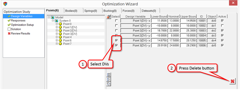 設計変数を削除するには、Select列で目的のDVのボックスをチェックしてDeleteボタンをクリックします。