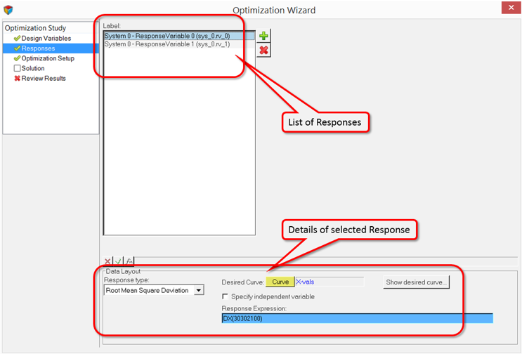 最適化ウィザードのResponsesの手順で、最適化スタディに応答変数(RV)を追加できます。