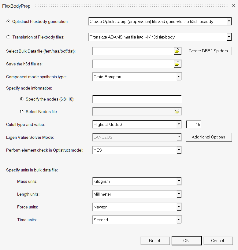 FlexBodyPrepウィザードからOptiStruct Flexbody generationオプションを選択すると、下記のオプションが使用できます: