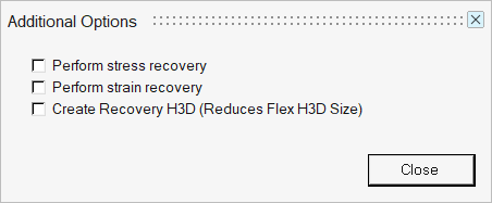 Perform stress recovery モーダル応力を計算し、弾性体H3Dファイルに保管するには、このオプションを選択します。HyperViewでMBDシミュレーション結果について応力を確認するには、このオプションが必要です。