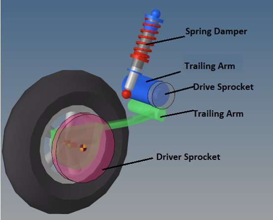 このサスペンションは、リアトレーリングアームとフレームの間で結合した単一のショックアブソーバーを使用します。トレーリングアームのフロントエンドの旋回軸がフレームに置かれ、他のエンドはリアホイールに取り付けられています。