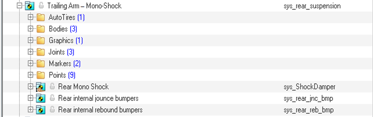 以下の図では、すべての構成要素を取り入れたリアサスペンションモデルのシステムをモデルブラウザビューで表示しています。リアモノショックトレーリングアームシステムには3つの“子”システムがあります。