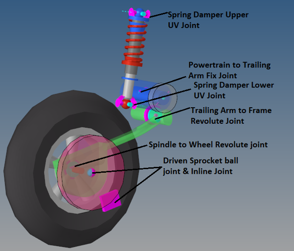 以下の図は、サスペンションでの各ジョイントの位置を示しています。図 5. ジョイント - リアモノショックトレーリングアームサスペンション