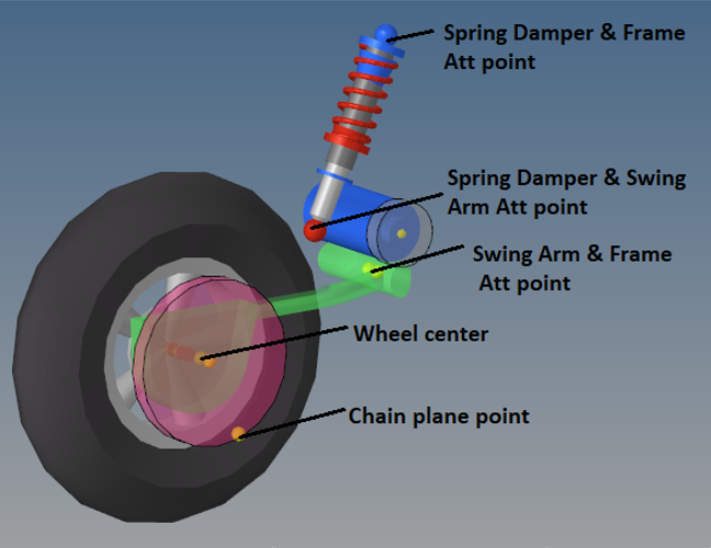 ポイントによって、サスペンションのボディを互いに結合するジョイントとブッシュの位置を定めます。以下の図は、リアモノショックトレーリングアームサスペンションの主要ポイントを示しています。図 3. 主要ポイント - リアモノショックトレーリングアームサスペンション