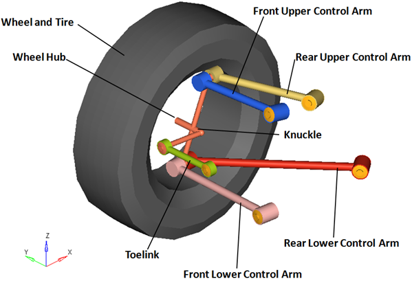 rear multi-linkサスペンションシステムは、車両半分の解析またはフルビークルの解析のどちらでも使用できます。デフォルトの形状および質量は乗用車または小型トラックと同じですが、モデルおよびデータは、大型トラックから縮尺モデルの車まで、任意のサイズの車両を反映するように修正できます。