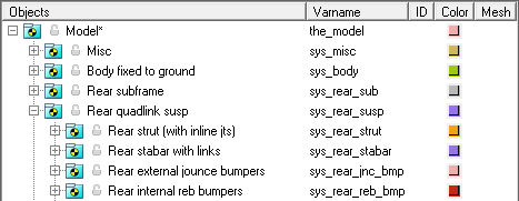 - オプションのサブシステムにより、ボディがサスペンションに追加されることがあります。例えば、ショックアブソーバーにより、2つのボディ(ショックロッドとショックチューブ)が追加されます。オプションのサブシステムで追加されたボディは、わかりやすいように、上の図からは省略されています。