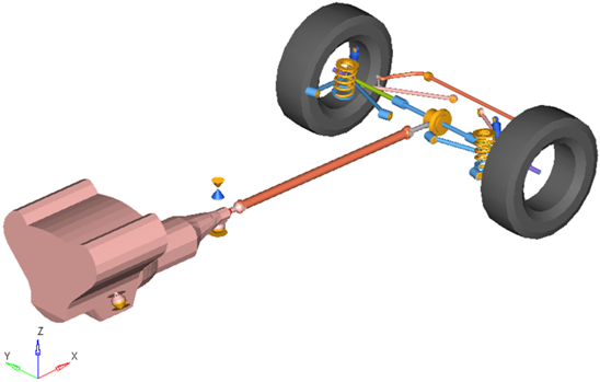 rear semi-trailing armサスペンションシステムは、車両半分の解析またはフルビークルの解析のどちらでも使用できます。デフォルトの形状および質量は乗用車または小型トラックと同じですが、モデルおよびデータは、大型トラックから縮尺モデルの車まで、任意のサイズの車両を反映するように修正できます。