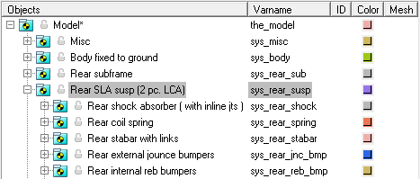 新しいサスペンションモデルを構築するときは、モデルに含まれるオプションのシステム(スタビライザーバーなど)をすべて使用してモデルを構築します。Projectブラウザを使用してオプションのシステムを直ちにオフにし、ベースサスペンションに対する解析を実行して適切な解が得られるようにします。オプションのシステムでデータを利用できるようになったら、これらオプションのシステムをアクティブにしてデータを読み込みます。