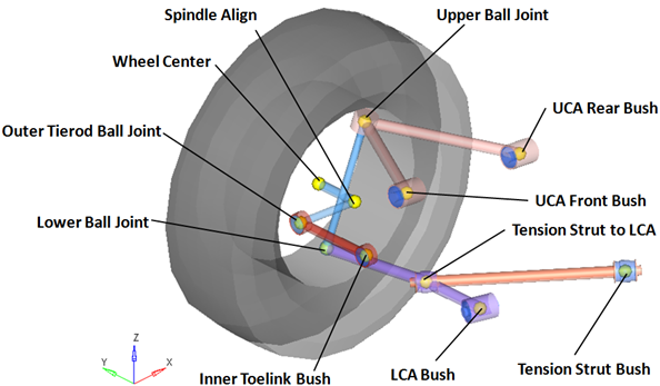- (System/Assemblyパネルを使用して)サスペンションがキネマティックサスペンションとして構築されている場合は、アッパーコントロールアームのブッシュが、フロントブッシュ位置にある単一の回転ジョイントに置き換えられ、その回転軸はフロントブッシュからリアブッシュまでのラインに沿って方向指定されます。ロアコントロールアームのブッシュも、同じ方法で回転ジョイントに置き換えられます。