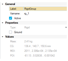 - プロパティエディターでは、剛体グループの総質量、慣性、重心に関する情報が得られます。