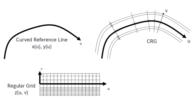 基準曲線上の各ポイントは、増分値uの倍数となる位置に指定します。 v 増分とu増分を組み合わせることで、グリッドのどこでも長さ方向と幅方向への移動が容易になります。図 1. CRG